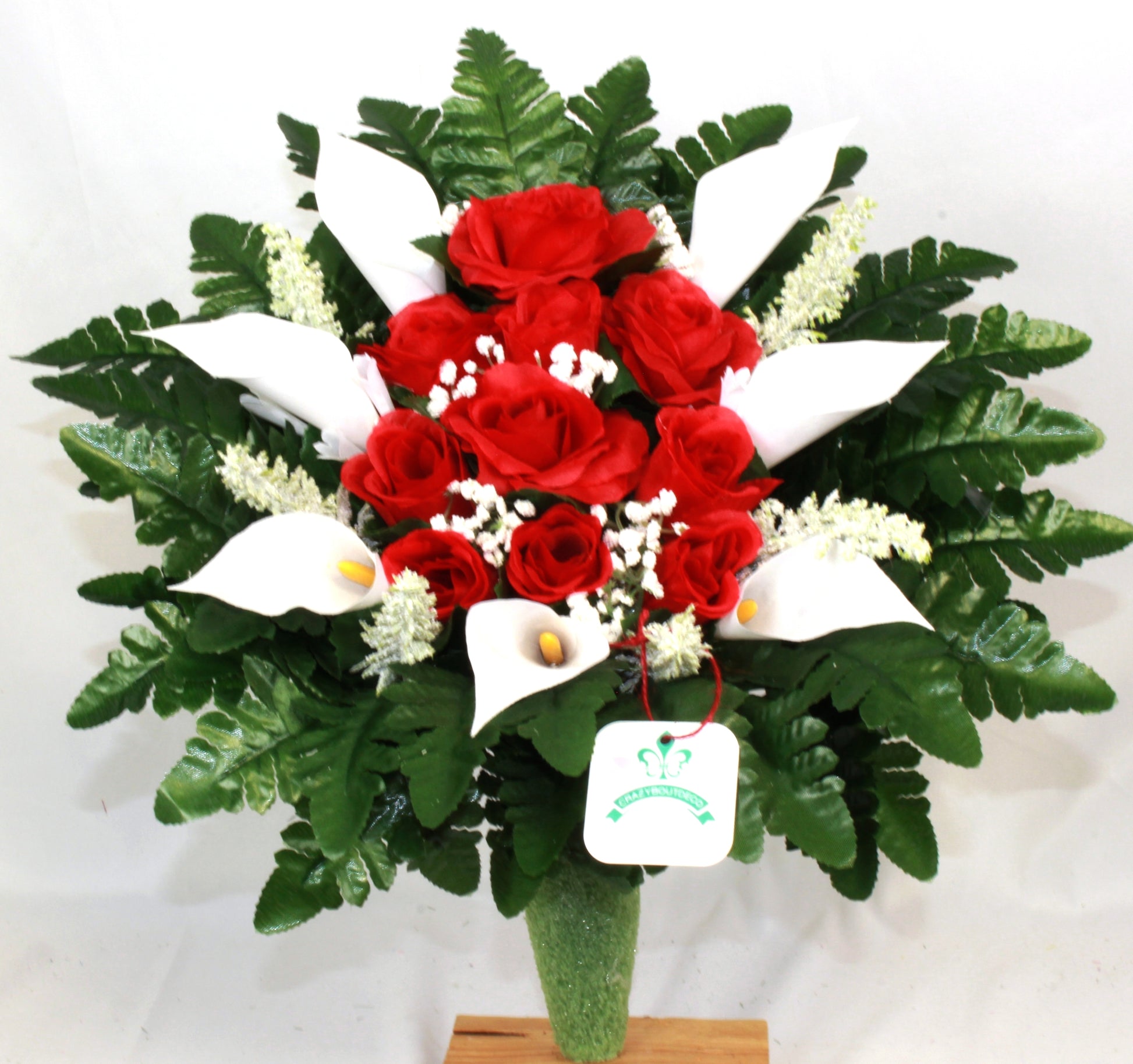 Handcrafted Red and White Roses w Calla Lilies Cemetery Flower Arrangement for Mausoleum -Memorial Flowers -Grave Decoration-Urn Arrangement