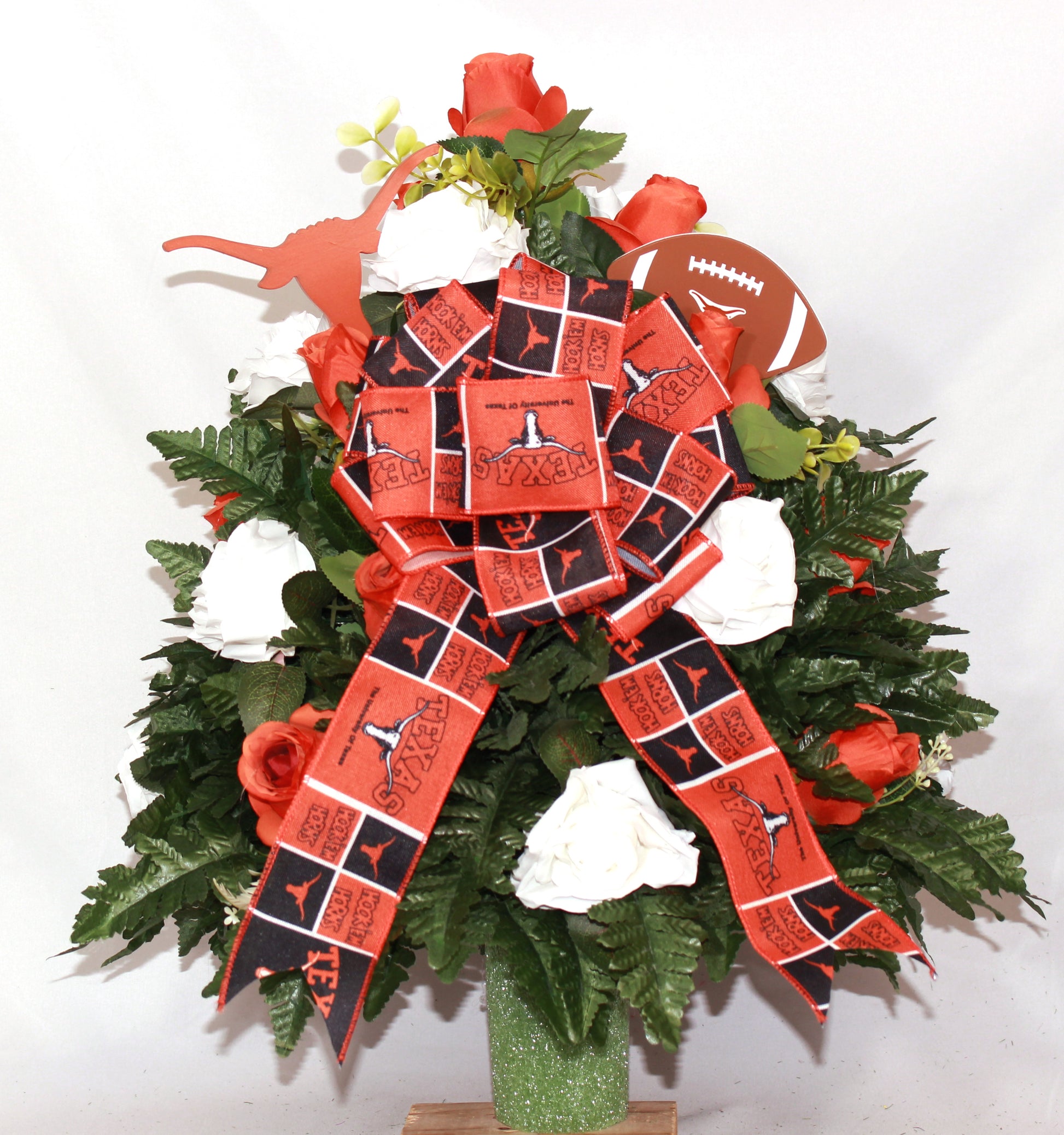 Enhance the beauty of your loved one's resting place with our XL Handcrafted Texas Longhorn Fan with bow Cemetery Flower Arrangement. This festive Fall Cemetery Headstone Cemetery vase is expertly handcrafted to bring a touch of holiday spirit to the memorial site, and a Beautiful Grave Decoration for the entire family to admire