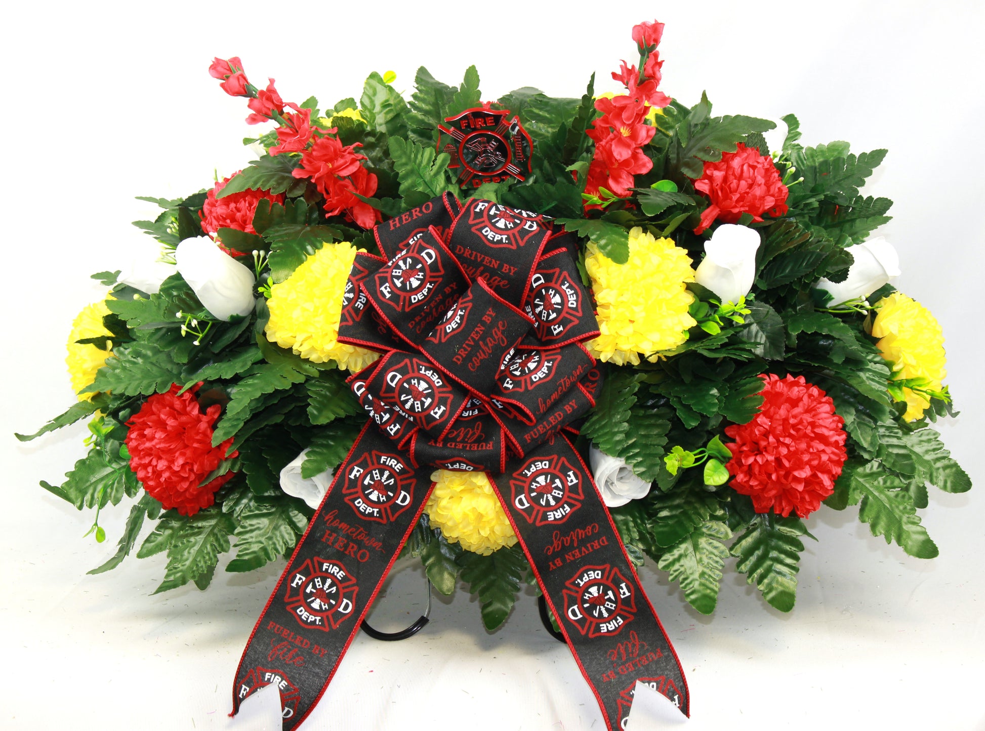 Enhance the beauty of your loved one's resting place with our XL Fireman Memorial with a Bow and badge Cemetery Flower Arrangement. This festive Cemetery Headstone Saddle is expertly handcrafted to bring a touch of any holiday spirit to the memorial site.