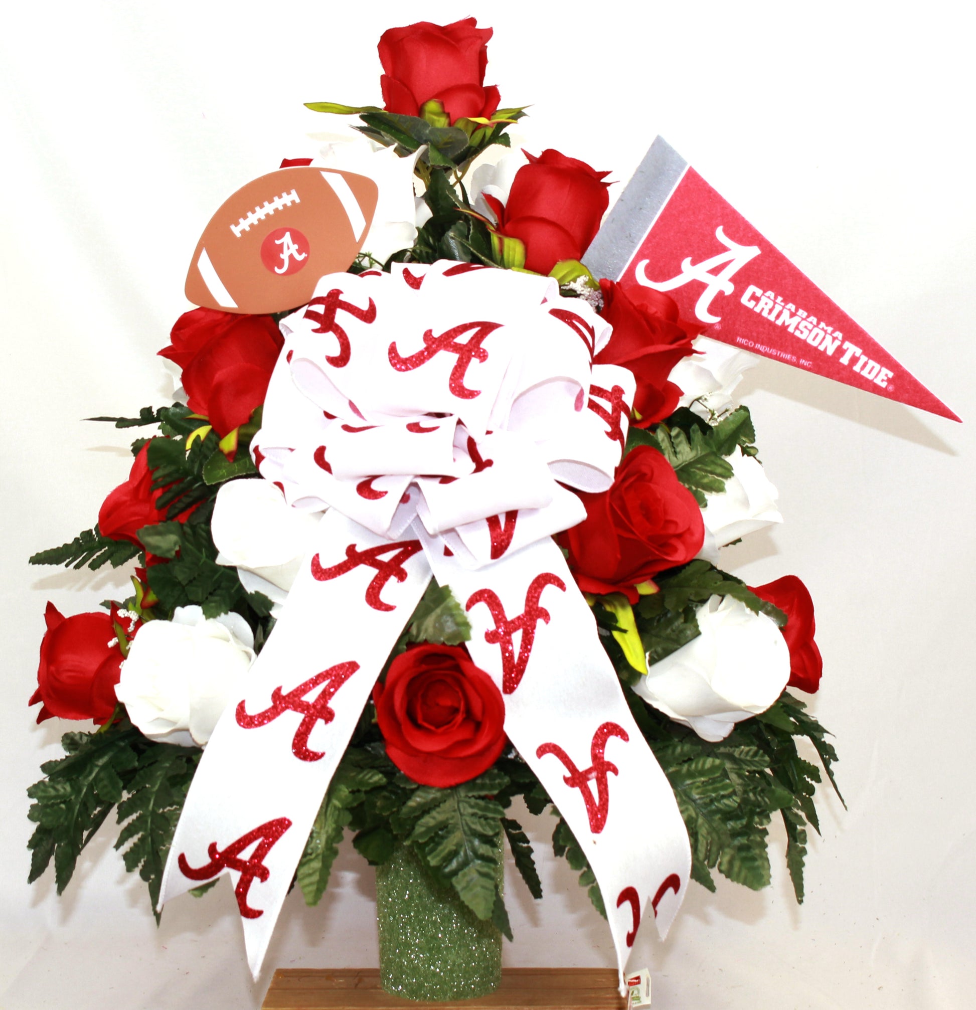 Enhance the beauty of your loved one's resting place with our XL Handcrafted Fall Crimson Tide Fan w/ bow Cemetery Flower Arrangement. This festive Fall Cemetery Headstone Cemetery vase is expertly handcrafted to bring a touch of holiday spirit to the memorial site, and a Beautiful Grave Decoration for the entire family to admire