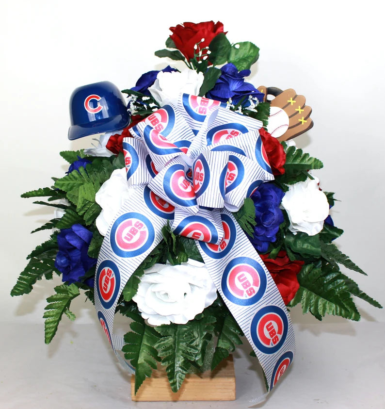 Enhance the beauty of your loved one's resting place with our XL Handcrafted Chicago Cubs Fan with Bow Cemetery Flower Arrangement. This festive Fall Cemetery Vase is expertly handcrafted to bring a touch of holiday spirit to the memorial site, and a Beautiful Grave Decoration for the entire family to admire