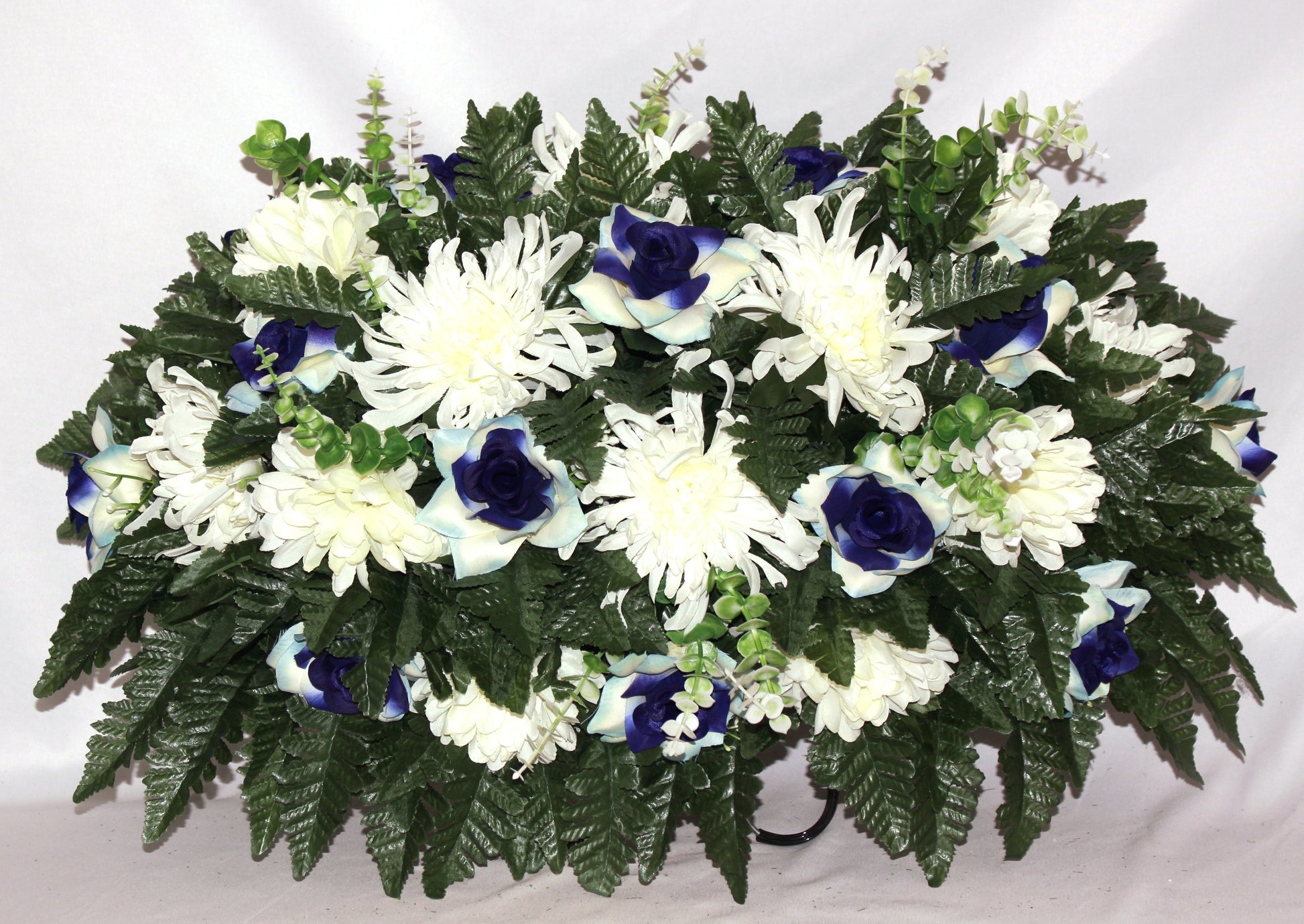 XL Handcrafted Blue/Creme Roses and Creme Spider Mum Cemetery Saddle Arrangement