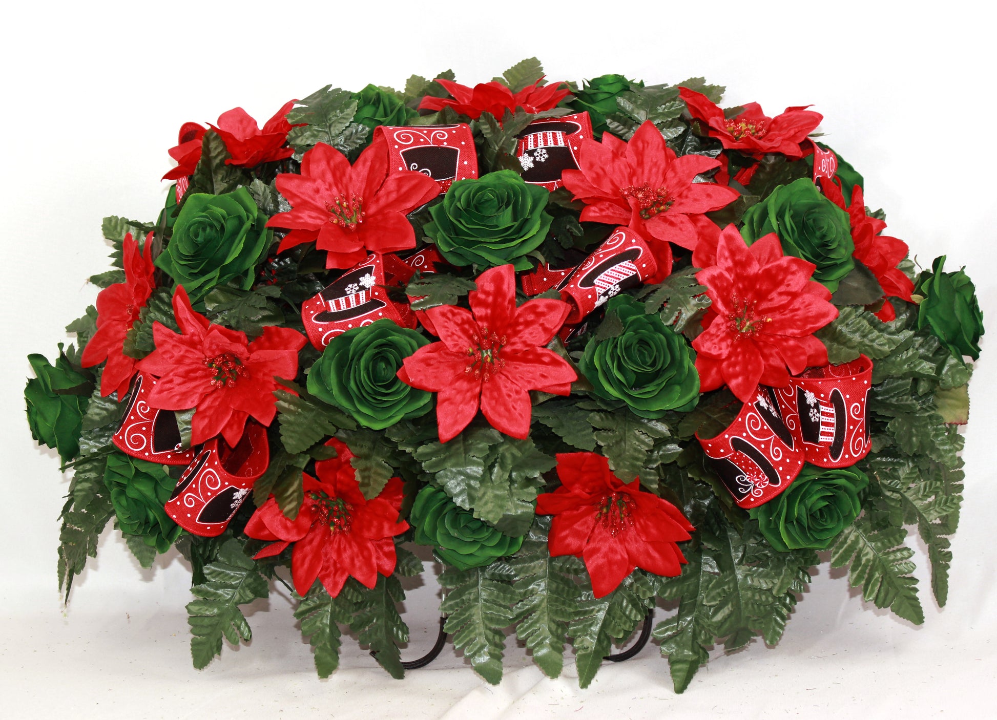 XL Handcrafted Christmas Green Roses and Red Poinsettia Cemetery Flower Arrangement-Cemetery Headstone Saddle