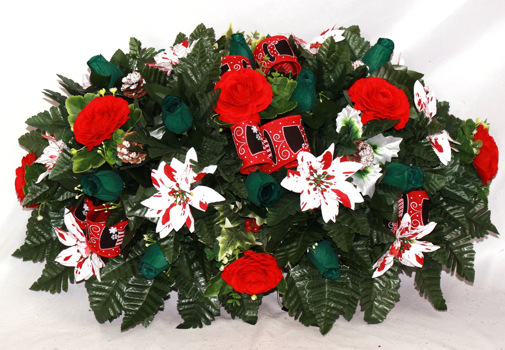 XL Handcrafted Christmas Green Roses and Red/White Poinsettia Cemetery Flower Arrangement-Cemetery Headstone Saddle