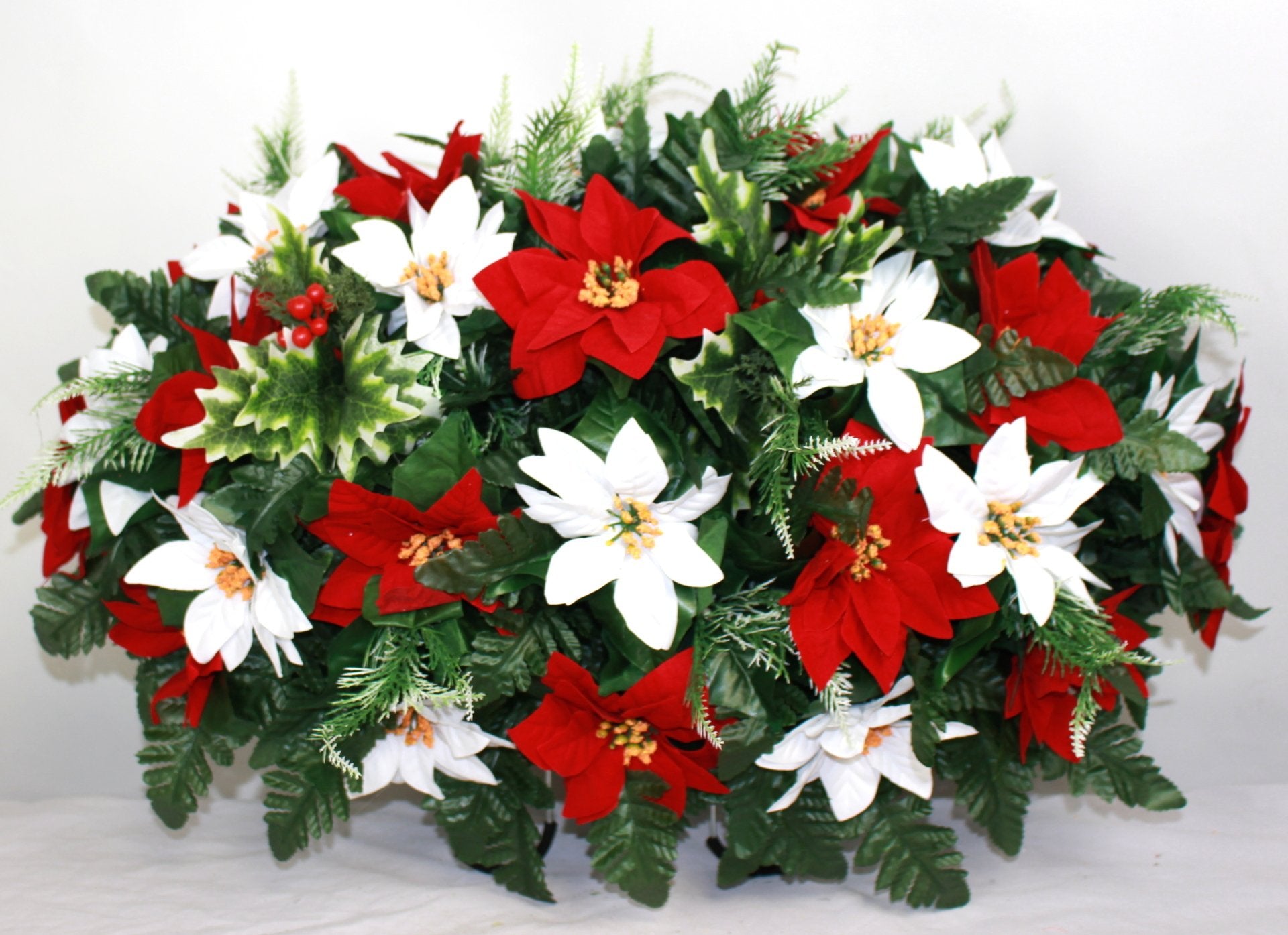 XL Handcrafted Christmas Red and White Poinsettia Cemetery Flower Arrangement-Cemetery Headstone Saddle
