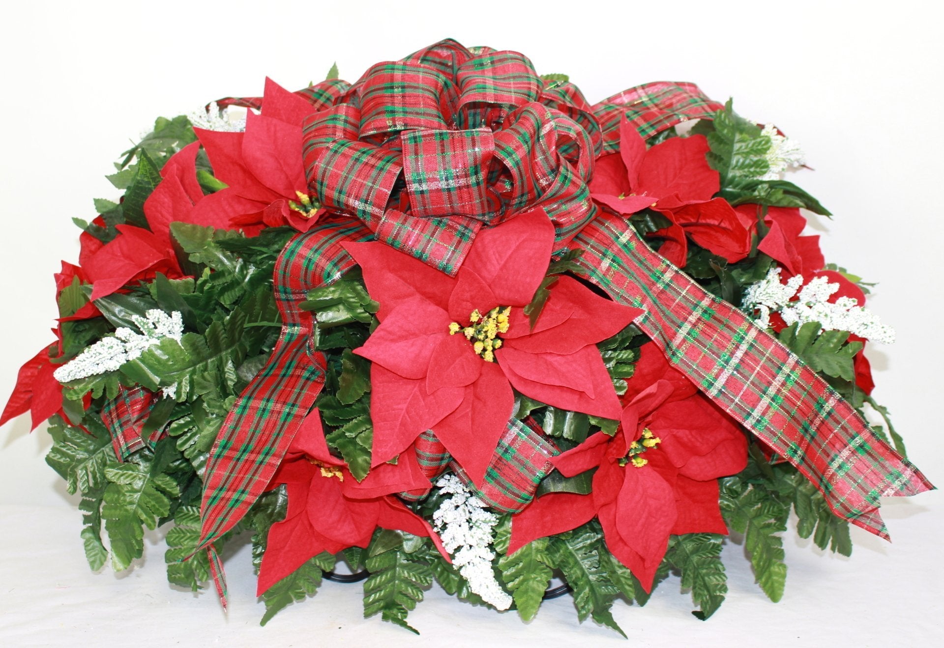 XL Handcrafted Christmas Red Poinsettias Cemetery Flower Arrangement-Cemetery Headstone Saddle