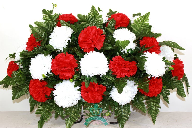 ✔️ XL Red and White Carnations Headstone Saddle for a festive and bold display.
