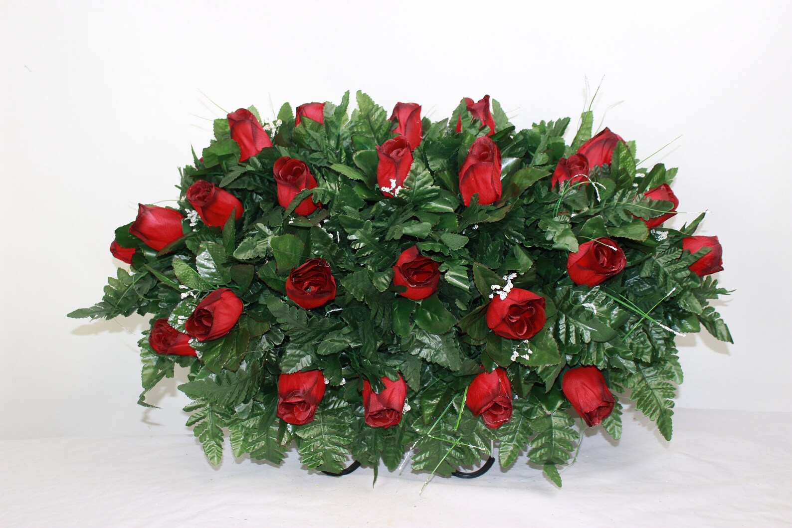 XL Handmade Red Closed Roses Cemetery Headstone Saddle Arrangement-Grave Decorations